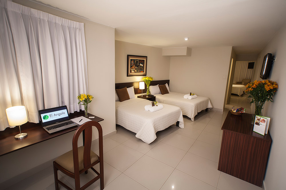 La habitacion familiar mide 45m2, tiene una cama king y una cama doble, mobiliario de madera, sala, comedor y kitchenette con microondas y rerigerador, wifi, Tv LCD con cable TV, baño con tina, ducha con agua caliente y fria, camas confortables con sabanas de algodón.Cama adicional es disponible de acuerdo a solicitud.